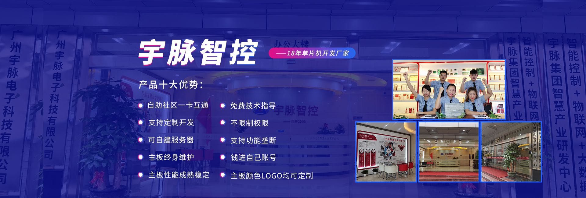 公司前身是2003年成立的宇脈電子石牌經(jīng)營(yíng)部,在廣州新賽格電子城擁有兩個(gè)實(shí)體店,專注于單片機(jī)開發(fā)、電子產(chǎn)品定制開發(fā)。2014年正式更名為廣州宇脈電子科技有限公司,專注打造無人值守自助設(shè)備控制系統(tǒng)及后臺(tái)管理系統(tǒng)方案定制的國(guó)家高新技術(shù)企業(yè)。并成為集研發(fā)、生產(chǎn)、銷售和服務(wù)于一體的領(lǐng)軍企業(yè)。